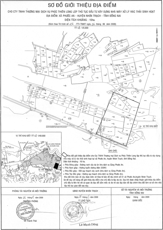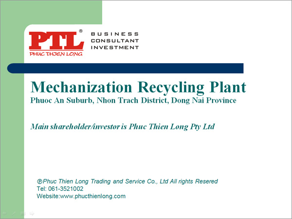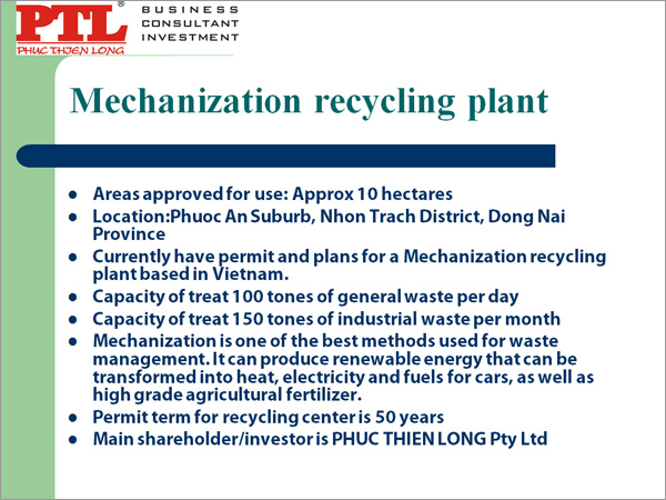 Trước thực tế này dưới sự chấp thuận của UBND tỉnh Đồng Nai, UBND huyện Nhơn Trạch tỉnh Đồng Nai Phúc Thiên Long đã và đang xây dựng dự án nhà máy xử lý rác thải tại xã Phước An - Đồng Nai. Chất thải sẽ chuyển hóa thành nhiệt, điện, nguyên liệu, phân bón... với công nghệ xử lý hiện đại và tiên tiến nhất hiện nay.